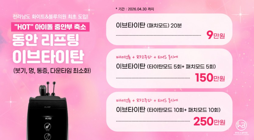 화이트&블루의원 이브타이탄 이벤트 페이지 정보 작성자 최고관리자 댓글 0건 조회 242회 작성일 26-03-04 15:03 목록 본문 화이트&블루의원 이브타이탄 이벤트 이전글화이트&블루의원 4월 이벤트 안내 26.03.31 다음글화이트&블루의원 3월 이벤트 안내 26.03.04 댓글 0 댓글목록 등록된 댓글이 없습니다.