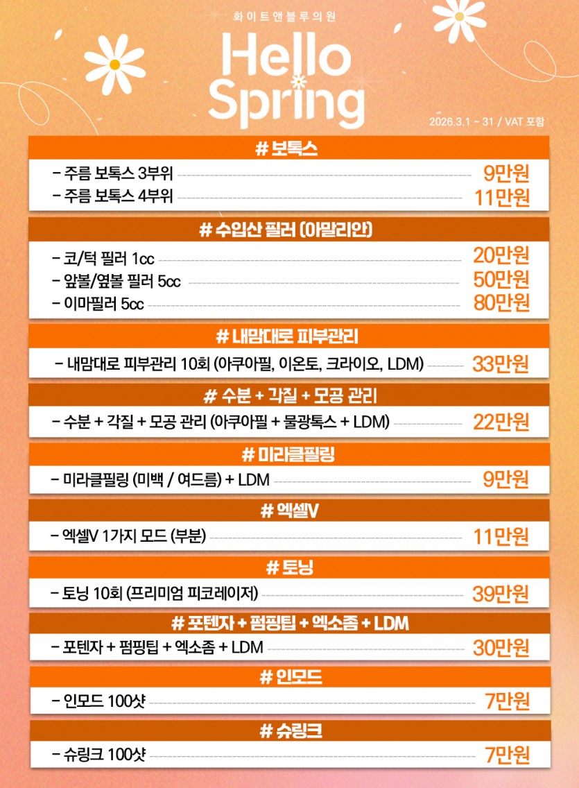 화이트&블루의원 3월 이벤트 안내 페이지 정보 작성자 최고관리자 댓글 0건 조회 29회 작성일 26-03-04 13:28 목록 본문 화이트&블루의원 3월 이벤트 안내 이전글화이트&블루의원 이브타이탄 입점이벤트 26.03.04 다음글화이트&블루의원 3월 휴진일 안내 26.02.25 댓글 0 댓글목록 등록된 댓글이 없습니다.