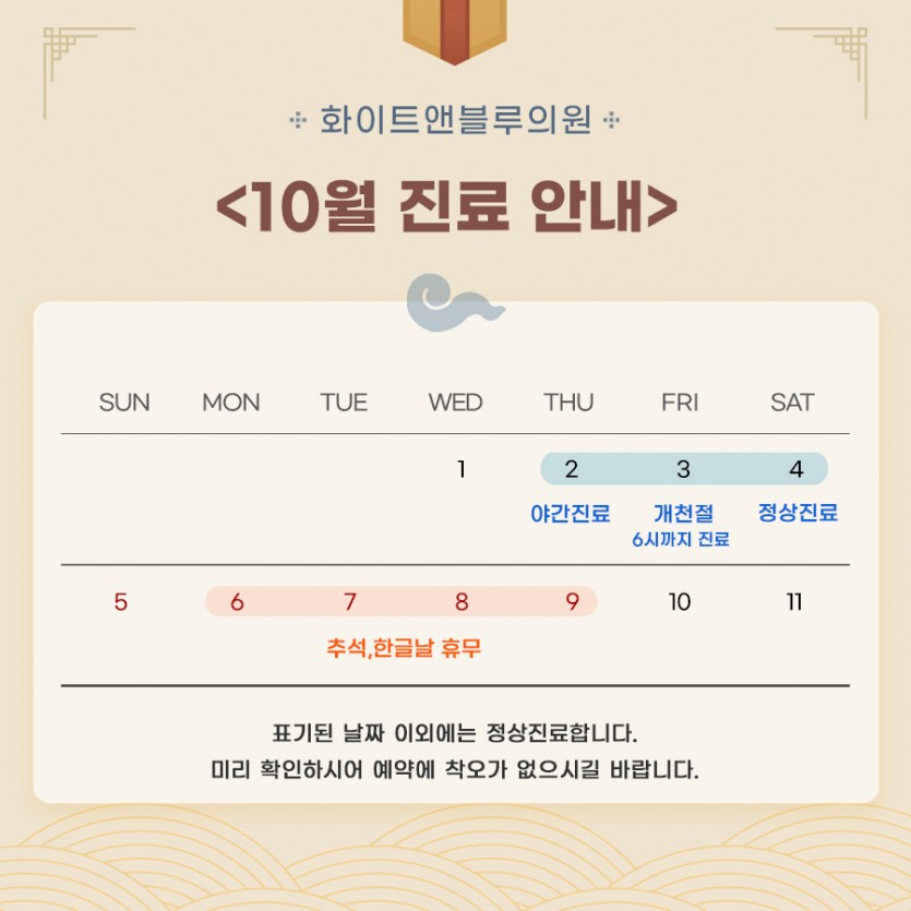 화이트&블루의원 10월 휴진일 안내 페이지 정보 작성자 최고관리자 댓글 0건 조회 198회 작성일 25-09-15 13:33 목록 본문 화이트&블루의원 10월 휴진일 안내 다음글화이트&블루의원 9월 이벤트 안내 25.08.29 댓글 0 댓글목록 등록된 댓글이 없습니다.